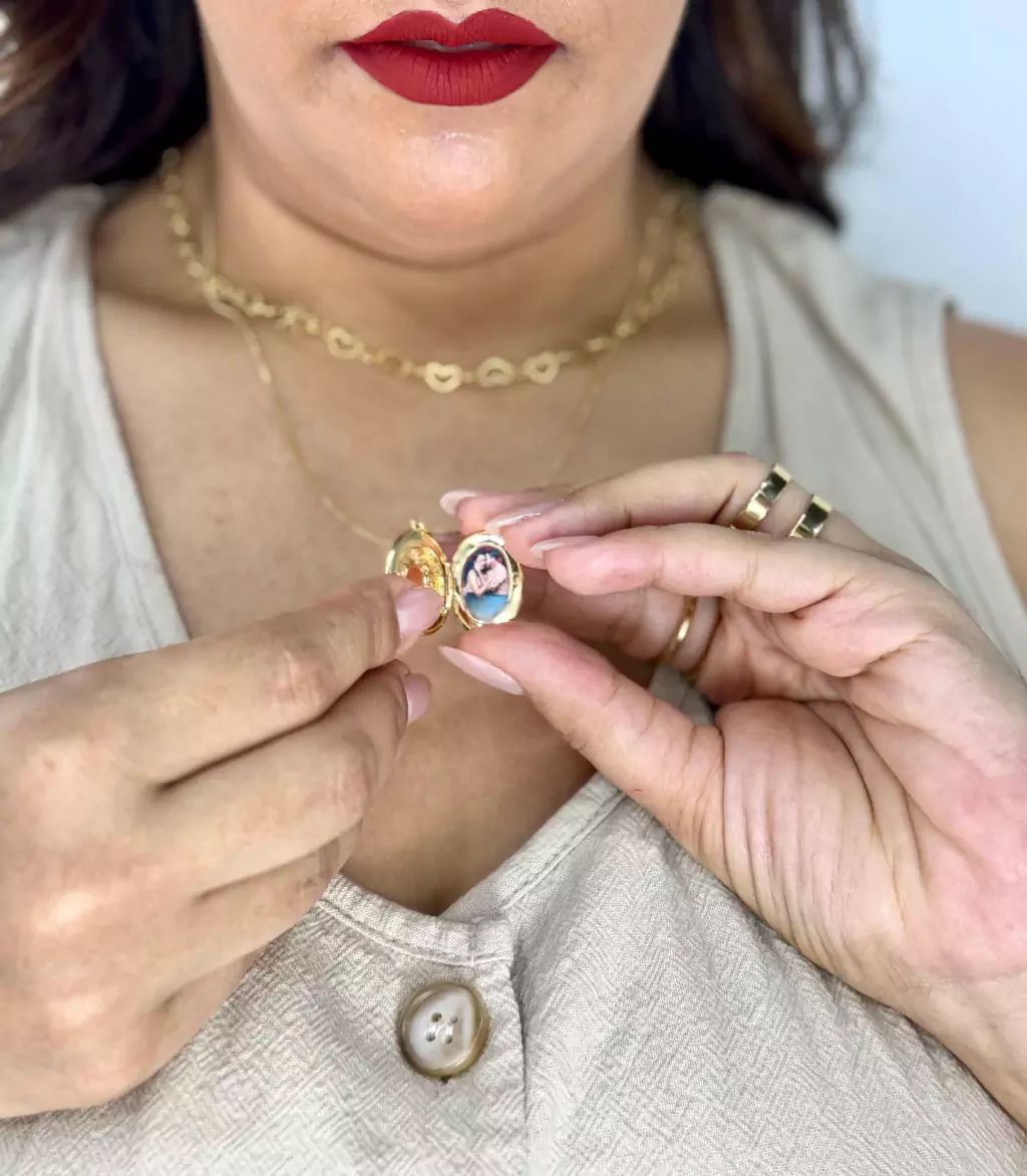 Relicário Oval, modelo moderno e cheio de charme. Além de carregar quem você ama trás sofisticação para seu look.